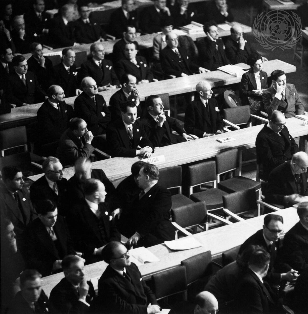 The first session of the United Nations General Assembly opened on 10 January 1946 at Central Hall in London, United Kingdom.