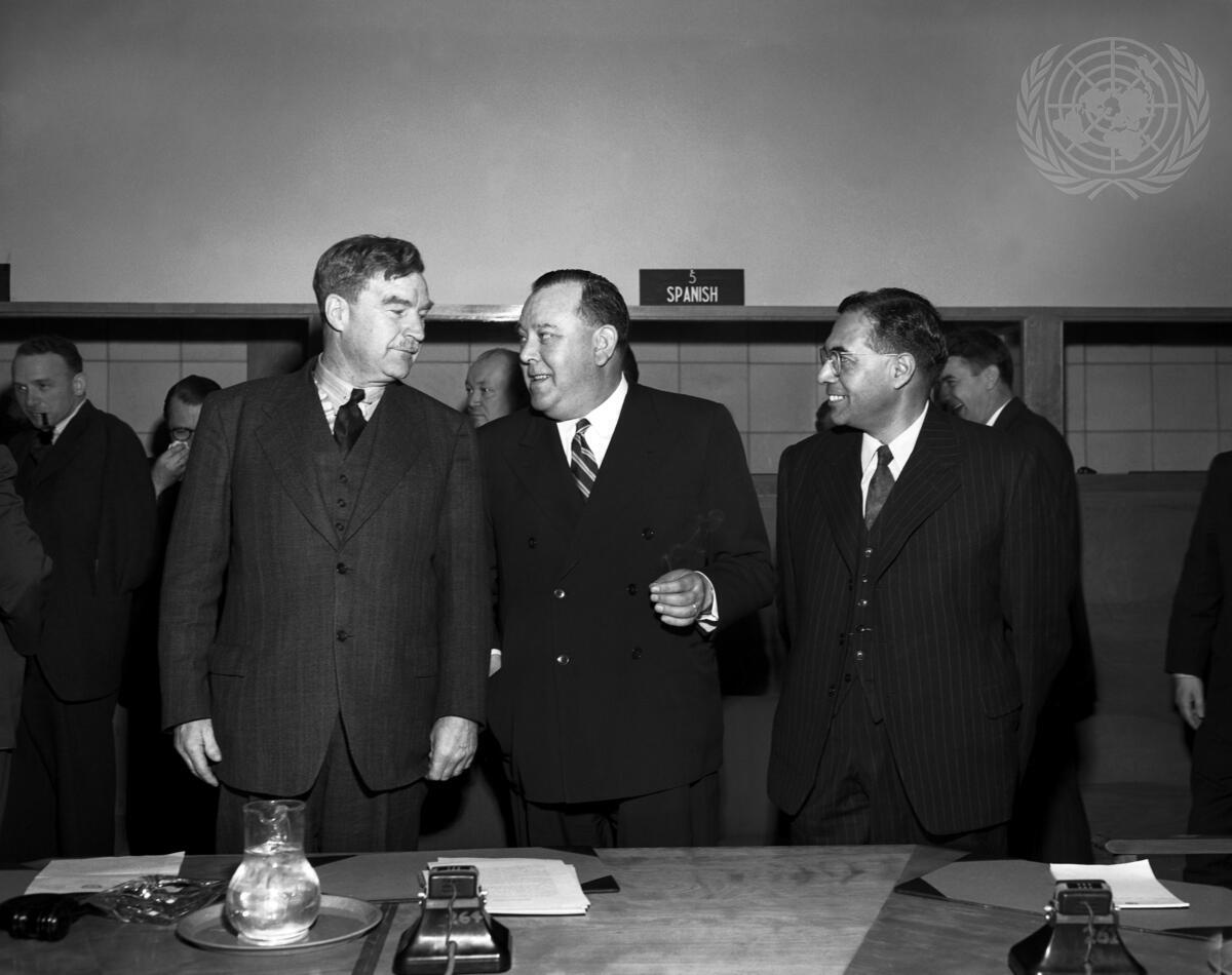 United Nations Secretary-General, Mr. Trygve Lie (center), during press conference, with General Howard Kennedy (left), from Canada, newly-appointed Director of the U.N. Relief and Works Agency for Palestine Refugees in the Near east, and Mr. Shamaldharee Lall (right), from India, newly-appointed Assistant Secretary-General for the UN Department of Conference and General Services.