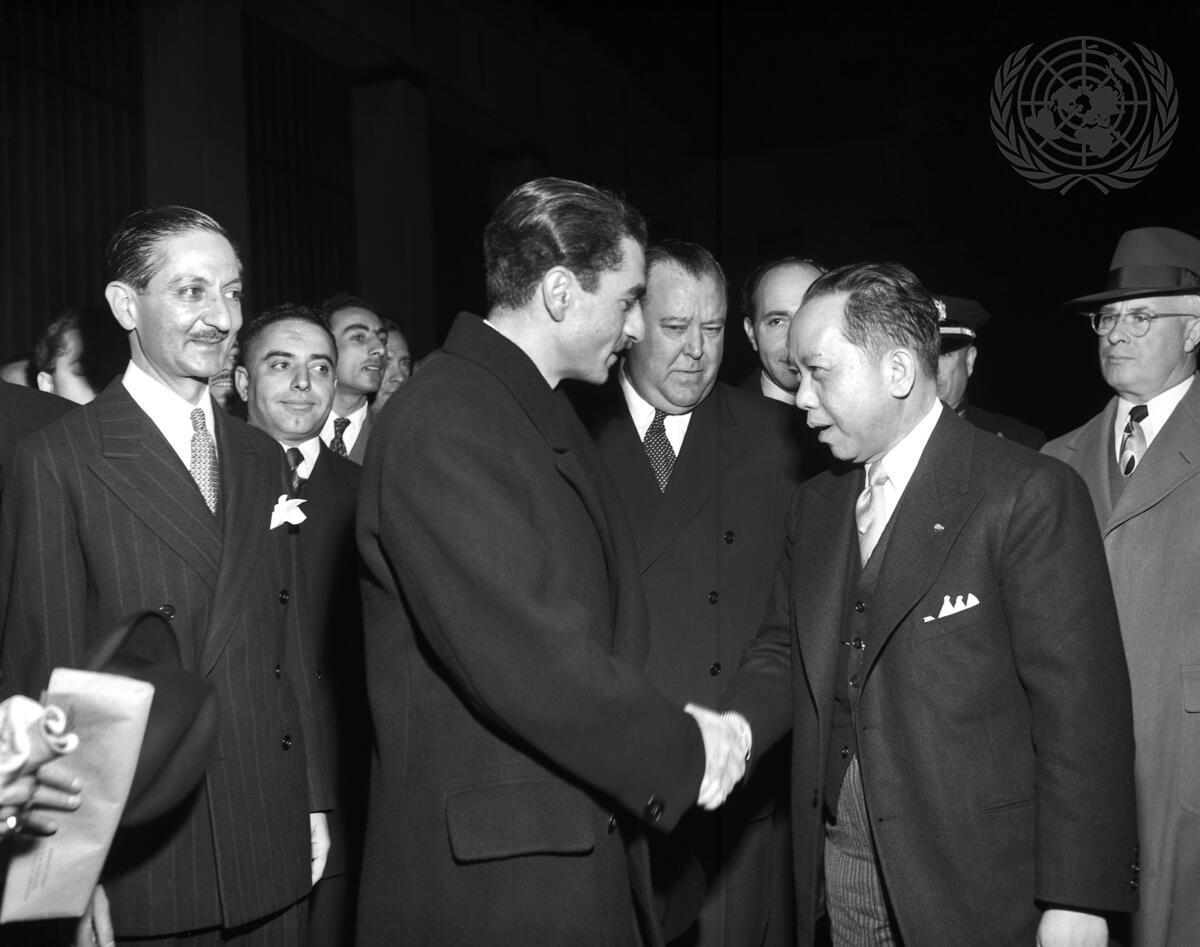 Mohammed Reza Pahlevi, Shah of Iran, greets Assembly President Carlos P. Romulo, right, as Ambassador Nasrollah Entezam, left, Iran's Permanent Representative at U.N. Headquarters, looks on. Mr. Trygve Lie, UN Secretary-General is seen in the center.