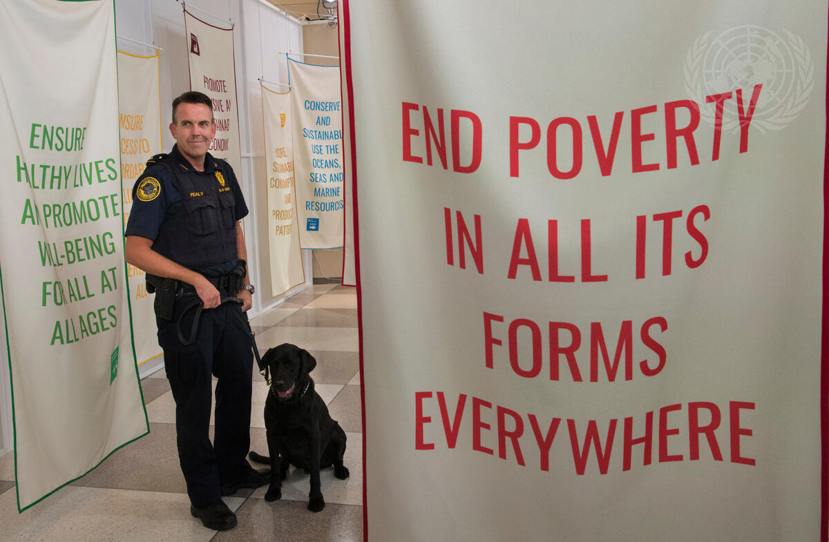 UN Security and Safety K-9 (Canine) Unit officer Ron Fealy and his K-9 fellow officer Titan patrol UN headquarters during the seventy-fourth session of the General Assembly.