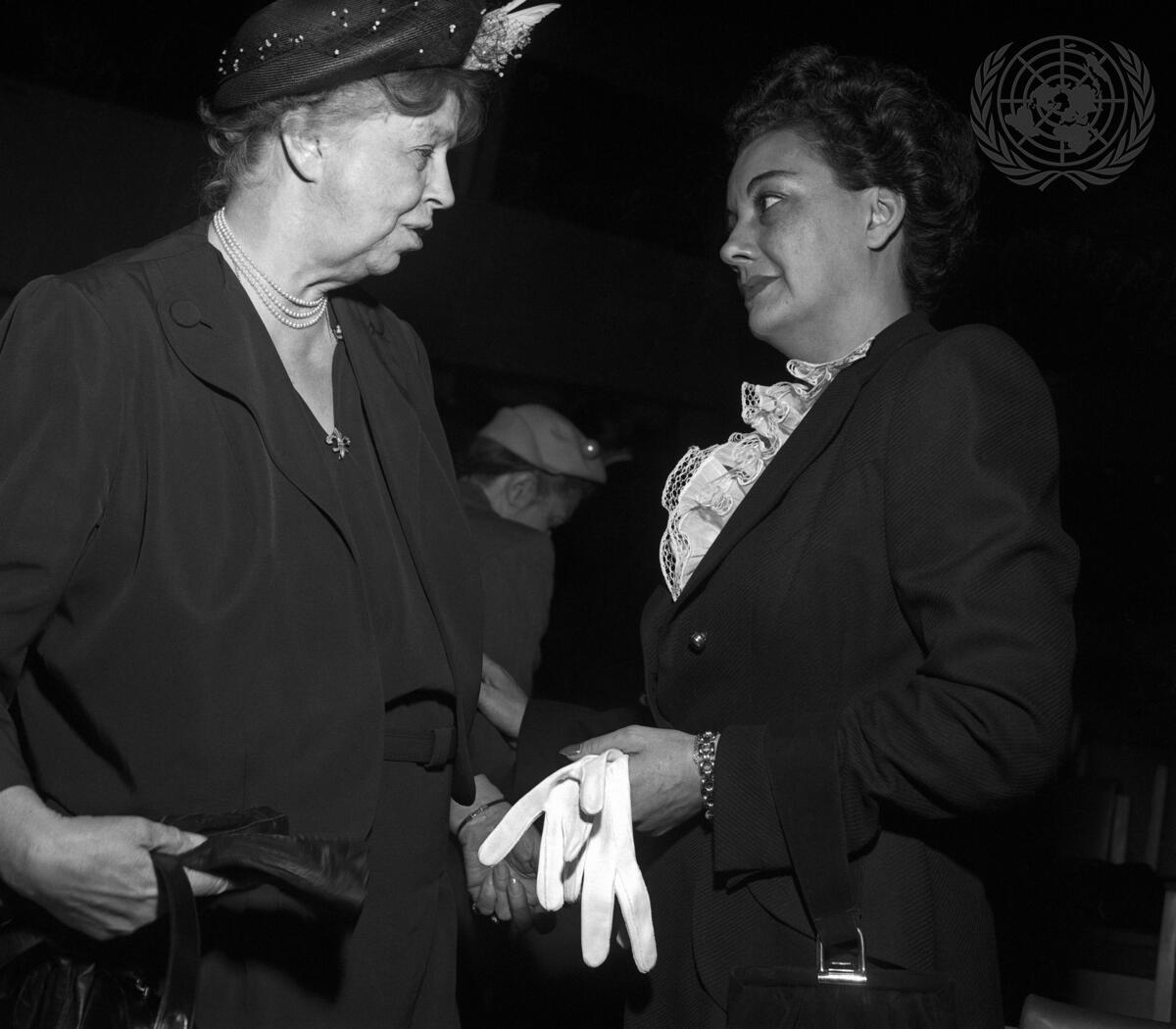 Mrs. Eleanor Roosevelt, United States Representative, left, is seen before a plenary meeting of the Assembly with Senorita Ana Figueroa, Representative of Chile. At the meeting, Mrs. Roosevelt spoke regarding the refusal of the Russian Government to allow Russian wives of foreign diplomats to leave the USSR with their husbands.