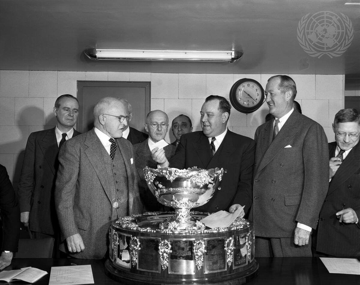 Drawing from the silver Davis Cup which goes to the winner of international tennis matches, U.N. Secretary-General Trygve Lie picks the countries which will play each other in the initial games of the competition. The United States now holds the coveted Cup. There will be 27 challenging nations this year.