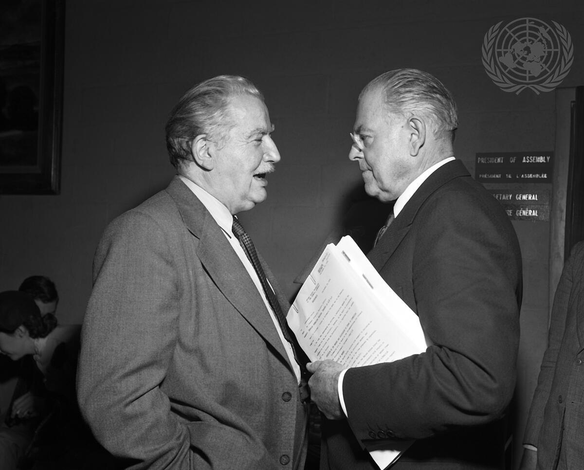 Mr. Joseph Bech, Luxembourg's Minister for Foreign Affairs, left, exchanges greetings on the opening day of the Fourth Assembly Session with Mr. Warren R. Austin, Permanent Representative of the United States.