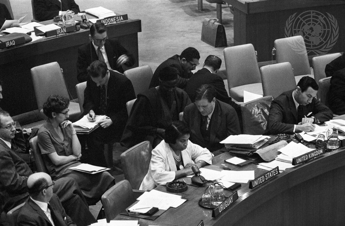 Here is a view of the conference room shortly before the meeting got under way. At the desk in the foreground are (left to right): Mr. Martin Aguirre (Venezuela); Miss Marian Anderson (U.S.A); Sir Andrew Cohen (U.K.), speaking with the Hon. Chief S.L. Akimtola, Minister of Communications and Aviation of Nigeria: and Dr. Jawdat Mufti, of the United Arab Republic.