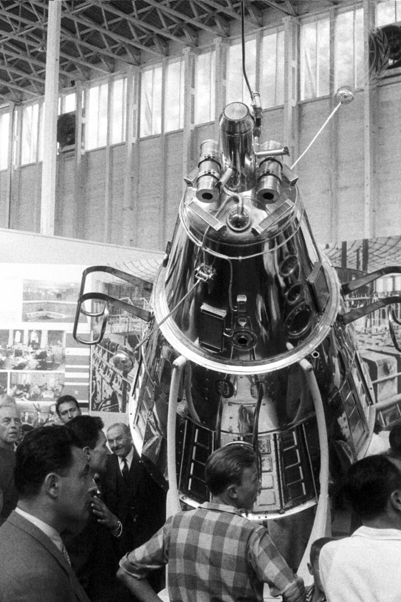 Visitors to the UN Scientific Exhibit are examining Sputnik III, on view at the Russian stand.