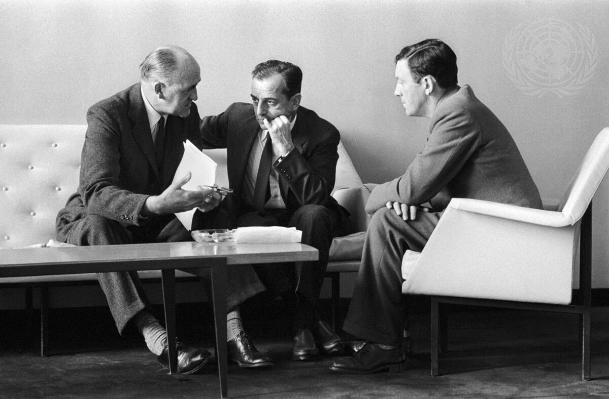 Seen here as they conferred shortly before attending this morning’s meeting of the United Nations General Assembly are (left to right) Mr. Frank Aiken, Minister for External Affairs of Ireland; Mr. Koca Popovic, Secretary of State for Foreign Affairs of Yugoslavia; and Dr. Conor Cruise O’Brien, Counsellor, Department of External Affairs of Ireland.