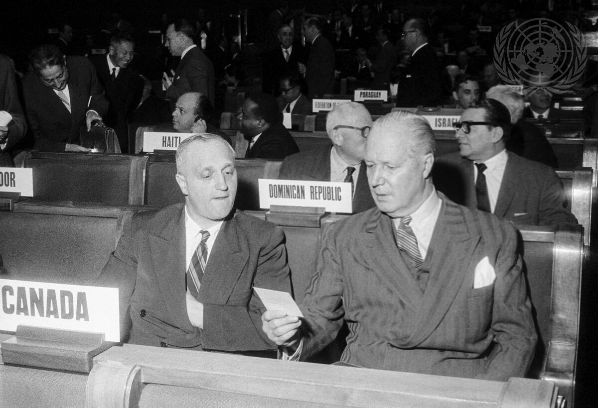 A view of the section of the conference hall shortly before a meeting got under way. In the foreground are two representatives of Canada - Mr. George A. Drew (right), Head of the Delegation, and Mr. Marcel Cadieux. [Exact date unknown].