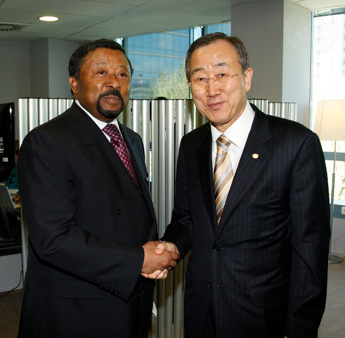 Secretary-General Ban Ki-moon (right) meets with Jean Ping, Chairperson of the African Union (AU) Commission.