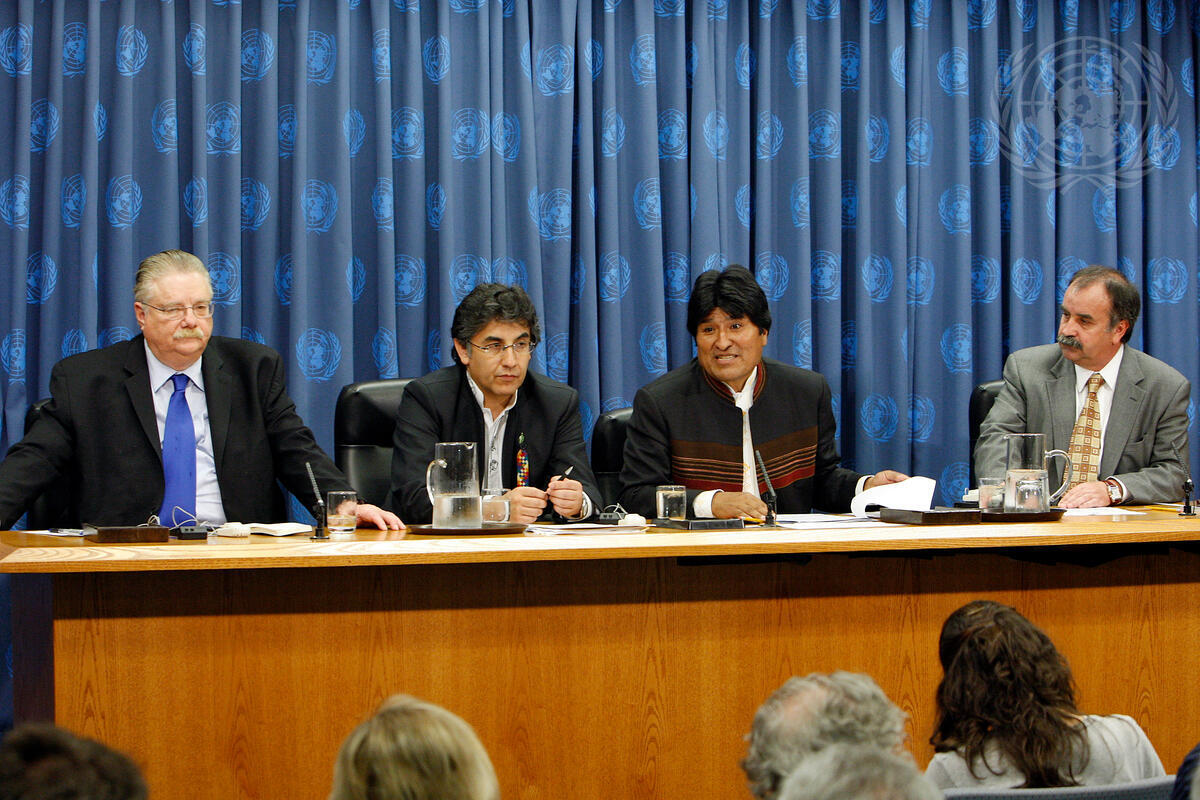 Evo Morales Ayma (third from left), President of the Plurinational State of Bolivia, addresses a press conference following a General Assembly meeting on the protection of global climate for present and future generations of mankind.
