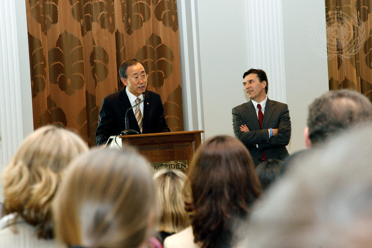 Secretary-General Ban Ki-moon (left, at podium) addresses the staff of the United Nations.
