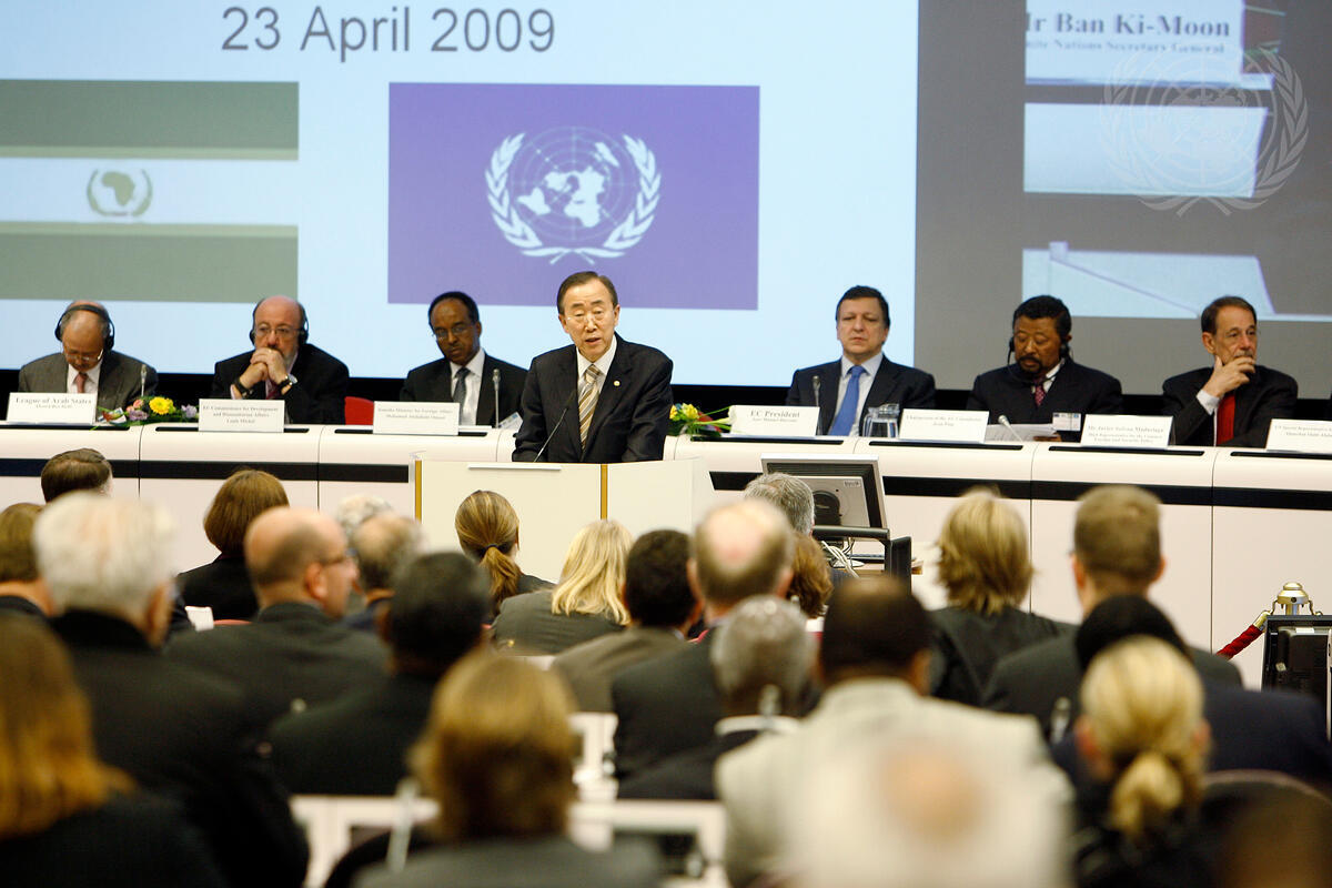 Secretary-General Ban Ki-moon (centre) makes a statement at the pledging conference for Somalia.