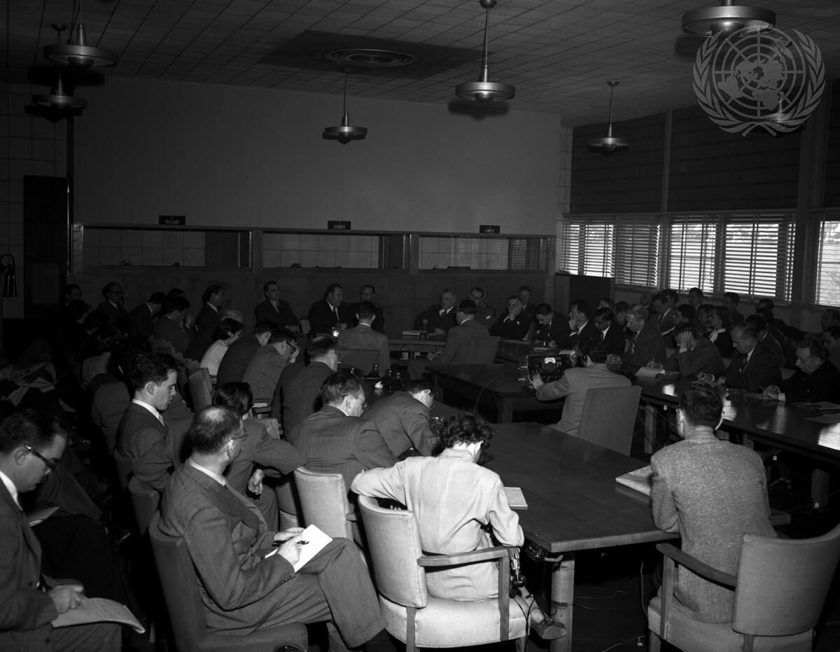 General view of press conference held by Secretary-General Trygve Lie. Asked about developments in Korea Mr. Lie replied:""... I have great confidence in the cease-fire committee which consists of three of the finest persons I have met in U.N.... I really wish them success, and if they do not succeed it will not be their fault.""