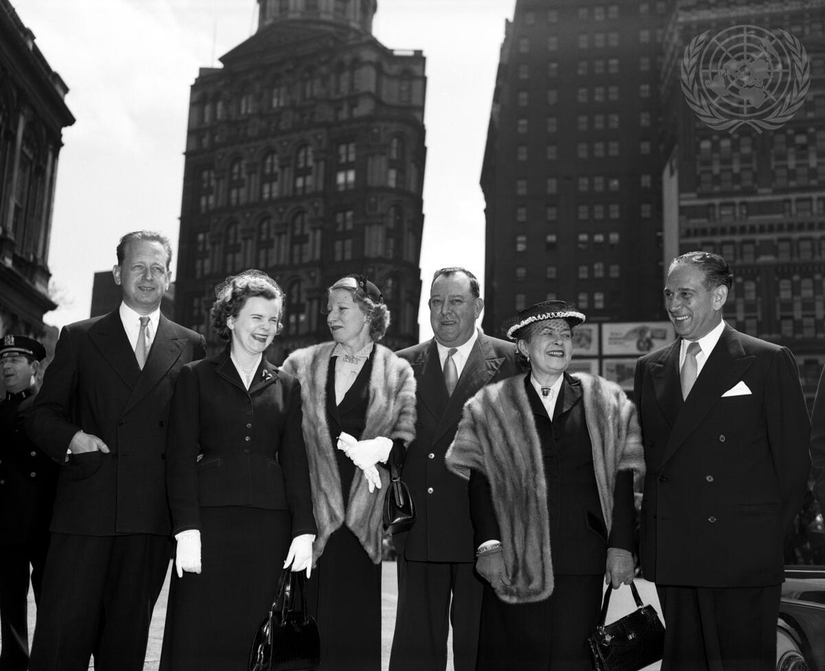 Photographed here (left to right) on City Hall Plaza: Mr. Dag Hammarskjöld; Miss Guri Lie, the former Secretary-General’s daughter; Mrs. Vincent Impellitteri; Mr. Trygve Lie; Mrs. Lie; and Mr. Vincent Impellitteri, Mayor of the City of New York.