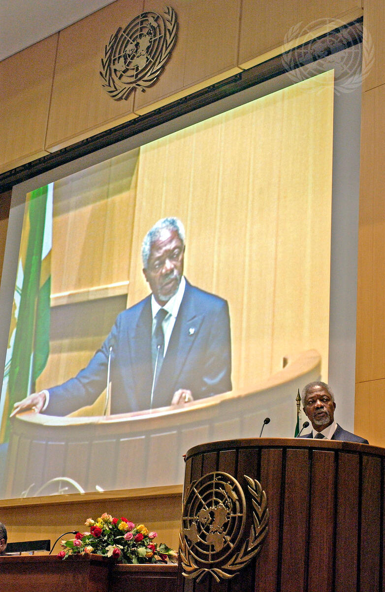 Secretary-General Kofi Annan (right, standing behind lectern) addresses the opening of the 3rd Ordinary Session of the Assembly of the African Union in Addis Ababa, Ethiopia.