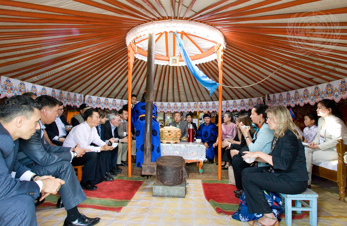 Secretary-General Ban Ki-moon (centre) visits a traditional ger, the one-room dwelling of the semi-nomadic herder community at Hustai National Park, and listens to the concerns of the community, who face problems of desertification and scarce water resources, in Tuv province, Mongolia.