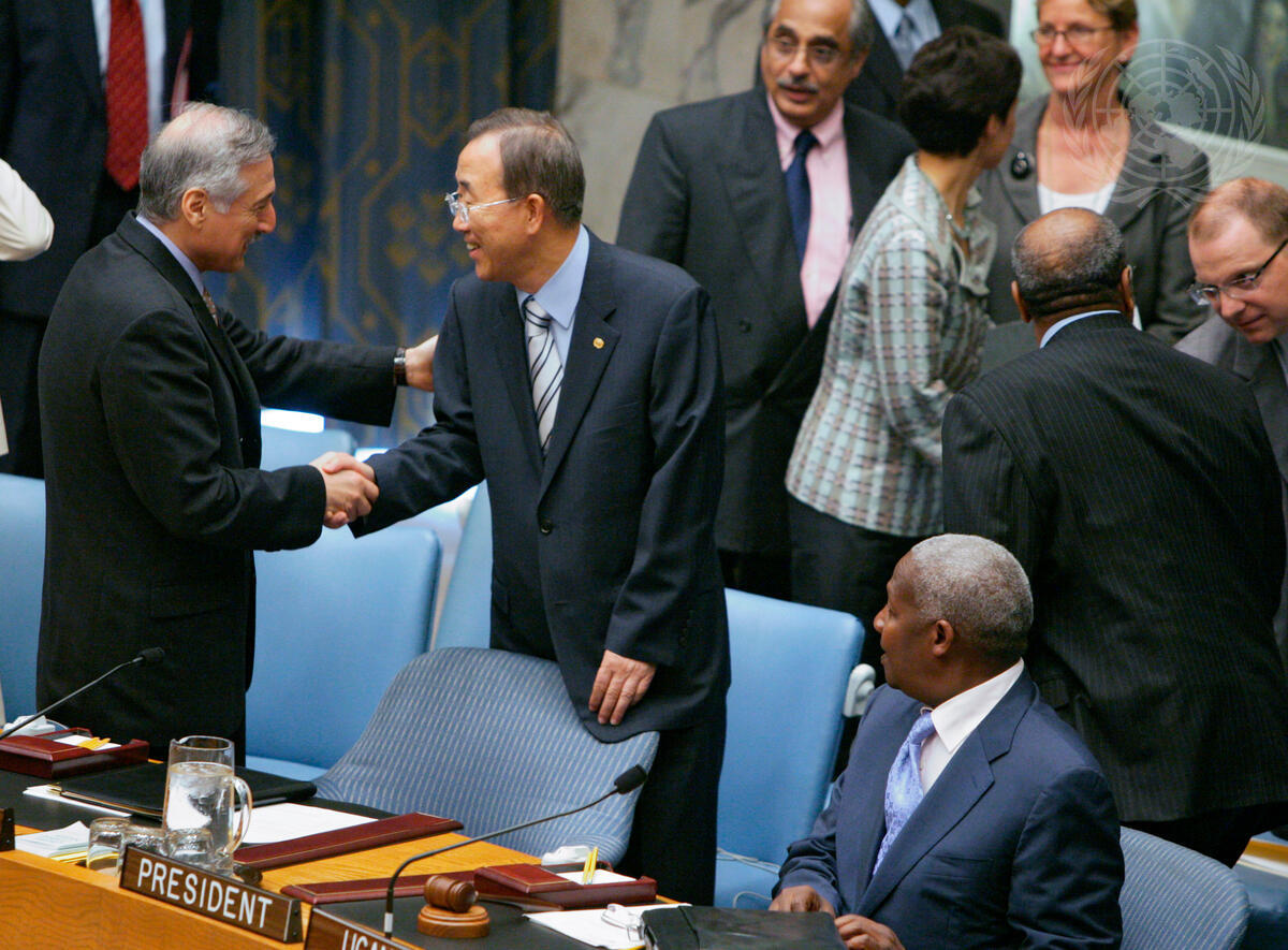 Secretary-General Ban Ki-moon (right) greets Heraldo Muñoz, Permanent Representative of Chile to the United Nations, on the floor of the Security Council Chamber, before a meeting on post-conflict peacebuilding.
