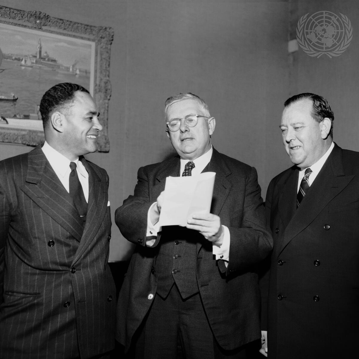 Dr. Herbert Evatt of Australia, centre, President of the Third Regular Session of the United Nations General Assembly, chats with United Nations Secretary-General Trygve Lie, right, and Dr. Ralph J. Bunche, UN Mediator for Palestine.