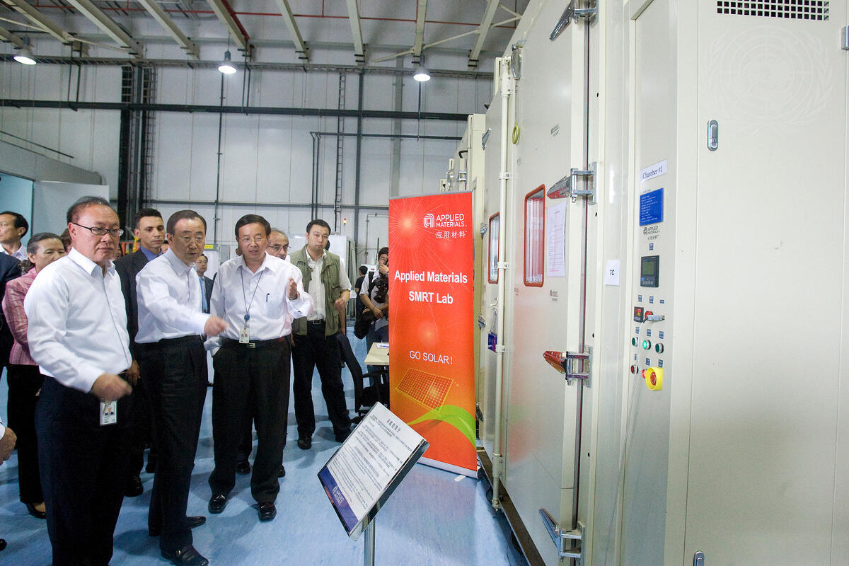 Secretary-General Ban Ki-moon (second from left, front row) visits the solar energy research facilities at Applied Materials Co. Ltd in Xi'an, China.
