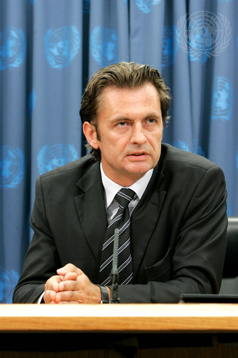 Christian Wenaweser, Permanent Representative of Liechtenstein to the United Nations and President of the Assembly of States Parties of the International Criminal Court (ICC), addresses a press conference on the occasion of eleventh anniversary of the adoption of the ICC Rome Statute.