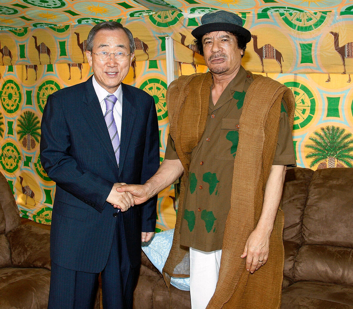Secretary-General Ban Ki-moon (left) meets with Muammar Al-Qadhafi, President of the Socialist People's Libyan Arab Jamahiriya.