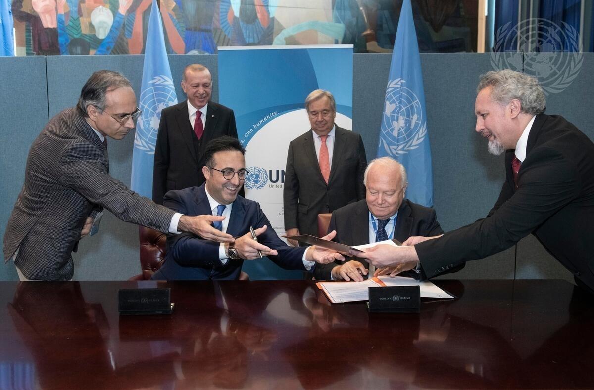 Recep Tayyip Erdogan (second from left, standing), President of the Republic of Turkey, and Secretary-General António Guterres (third from right), witnessing the signing ceremony between Mehmet Ilker Ayci (seated left), Chairman of the Board and Executive Committee of Turkish Airlines, and Miguel Angel Moratinos (seated right), High Representative for the United Nations Alliance of Civilizations.