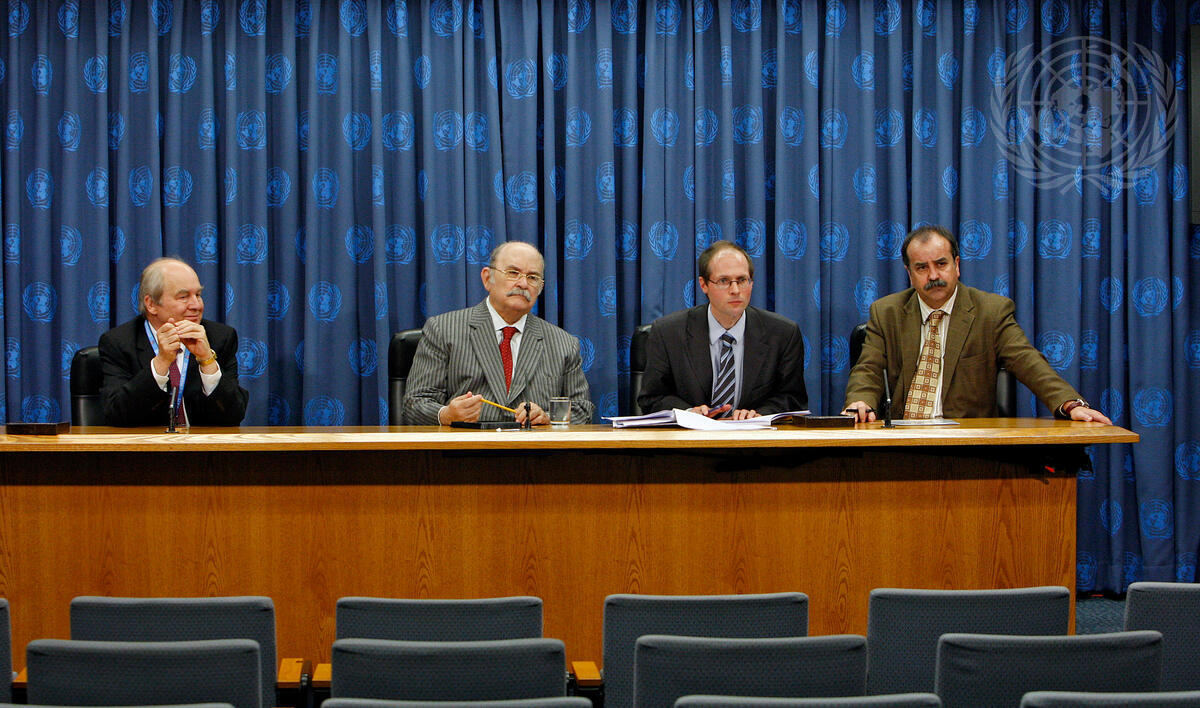 Miguel d'Escoto Brockmann (second from left), President of the sixty-third session of the General Assembly, and Olivier De Schutter (third from left), United Nations Special Rapporteur on the Right to Food, participate in a press conference on the global food crisis and the right to food.
