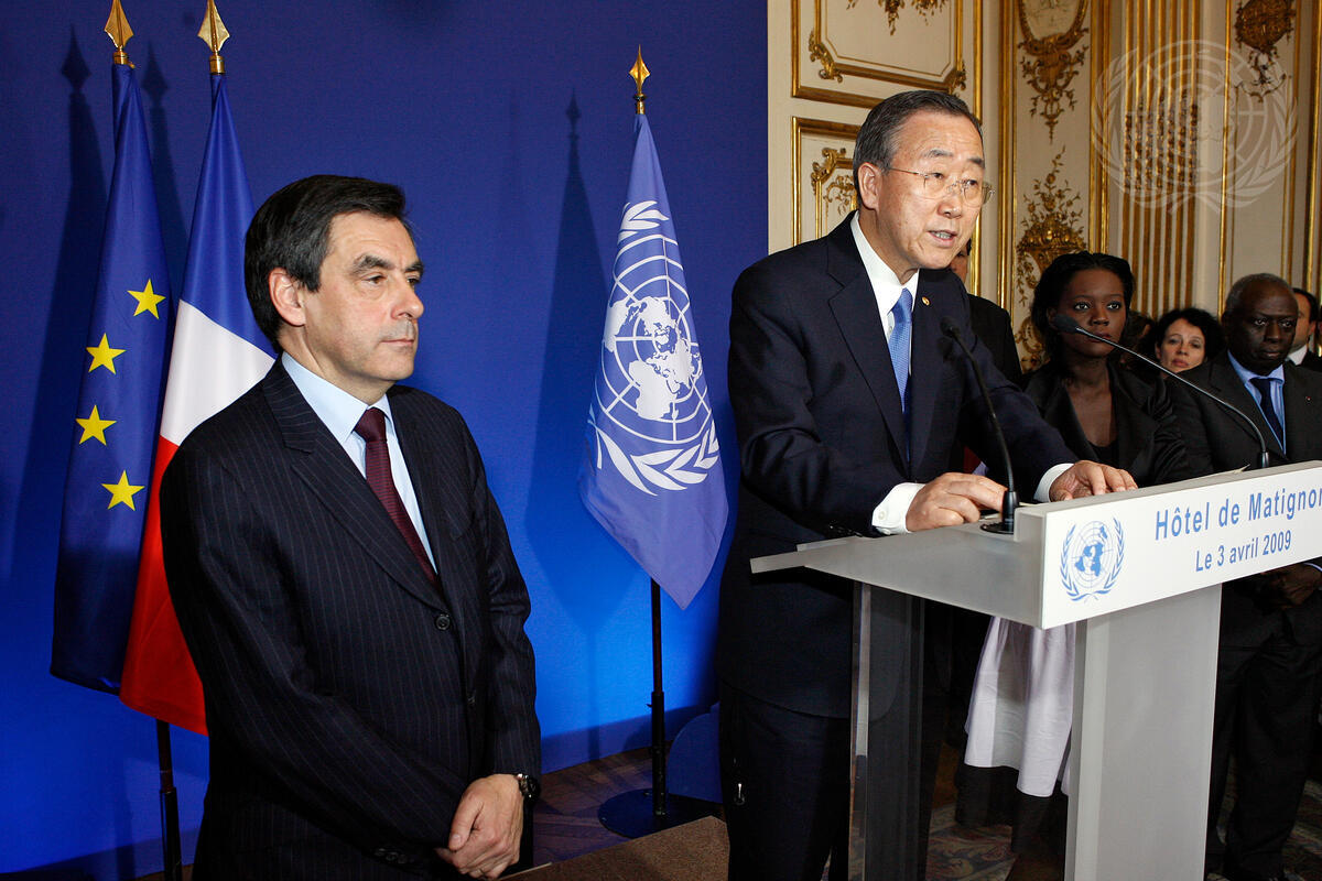 Secretary-General Ban Ki-moon participates in a joint press conference with François Fillon, Prime Minister of France.
