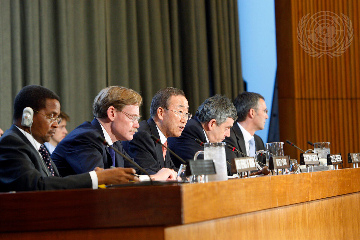 Secretary-General Ban Ki-moon (centre) attends a high-level meeting on the theme, ""Investing in Our Common Future: Healthy Women, Healthy Children"", chaired by Gordon Brown (second from right), Prime Minister of the United Kingdom and Northern Ireland, and Robert Zoellick (second from left), President of the World Bank. The event was hosted by the Taskforce on Innovative International Financing for Health Systems, also co-chaired by the Prime Minister and Bank President.