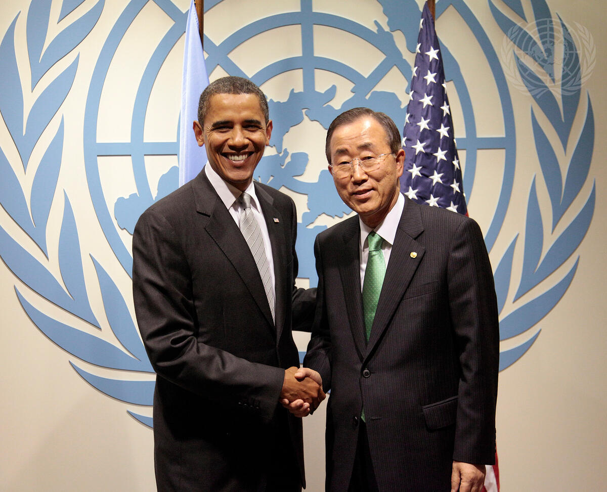 Secretary-General Ban Ki-moon (right) meets with Barack Obama, President of the United States of America.