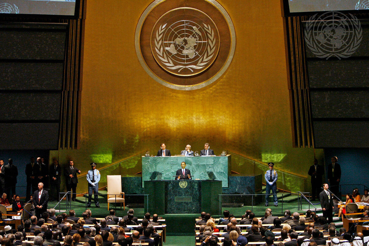 Barack Obama (centre, at lectern), President of the United States of America, addresses the general debate of the sixty-fourth session of the General Assembly. Behind him are (left to right): Secretary-General Ban Ki-moon; Ali Abdussalam Treki, President of the Assembly's current session; and Muhammad Shaaban, Under-Secretary General for General Assembly Affairs and Conference Management.