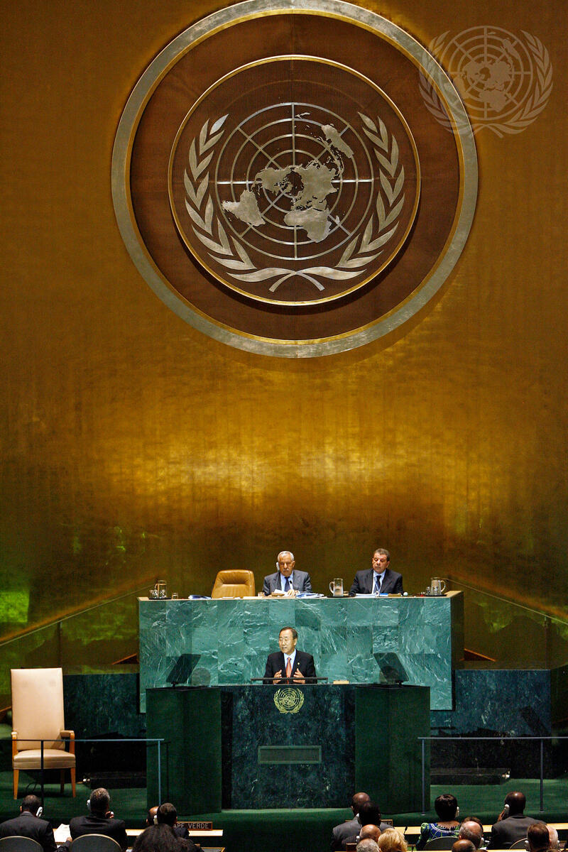 Secretary-General Ban Ki-moon addresses the general debate of the sixty-fourth session of the General Assembly. Behind him are Ali Abdussalam Treki (left), President of the sixty-fourth session of the General Assembly, and Muhammad Shaaban, Under-Secretary-General for General Assembly and Conference Management.