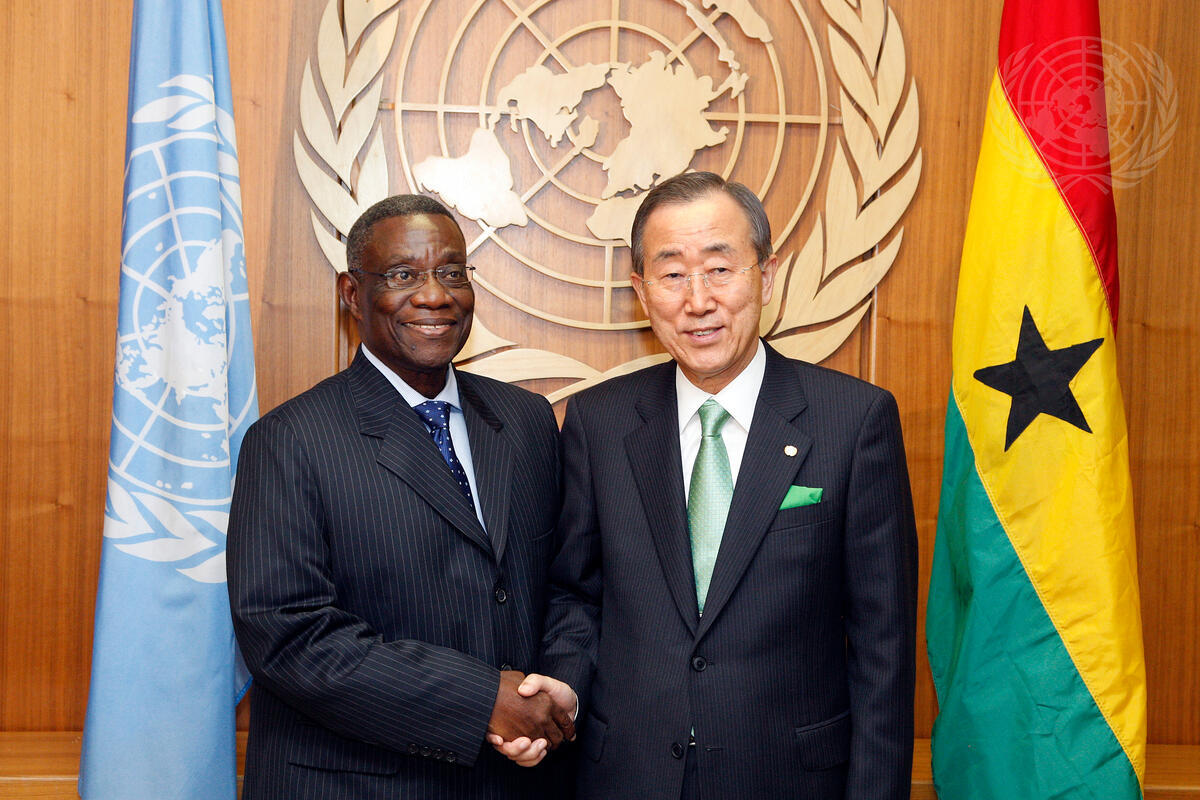 Secretary-General Ban Ki-moon (right) meets with John Evans Atta Mills, President of Ghana.