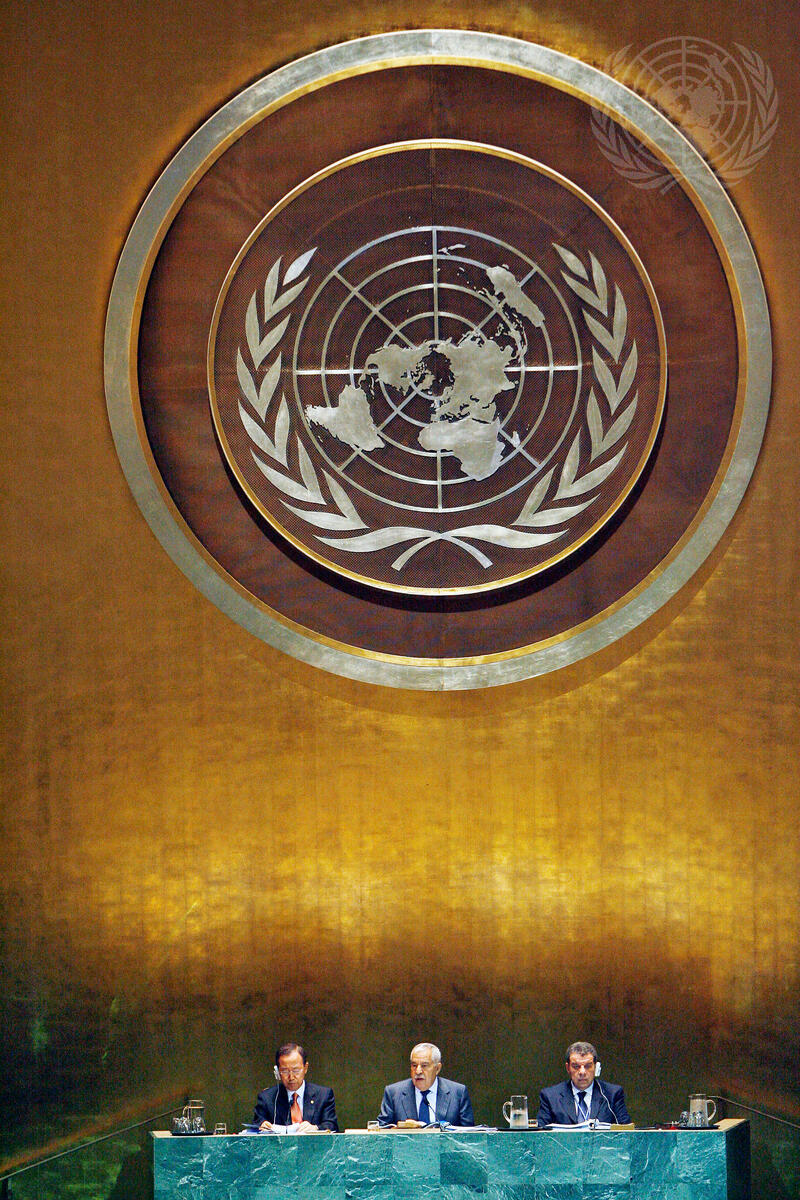 Ali Abdussalam Treki (centre), President of the sixty-fourth session of the General Assembly, addresses the Assembly's sixty-fourth session. He is flanked by Secretary-General Ban Ki-moon (left) and Muhammad Shaaban, Under-Secretary-General for General Assembly and Conference Management.