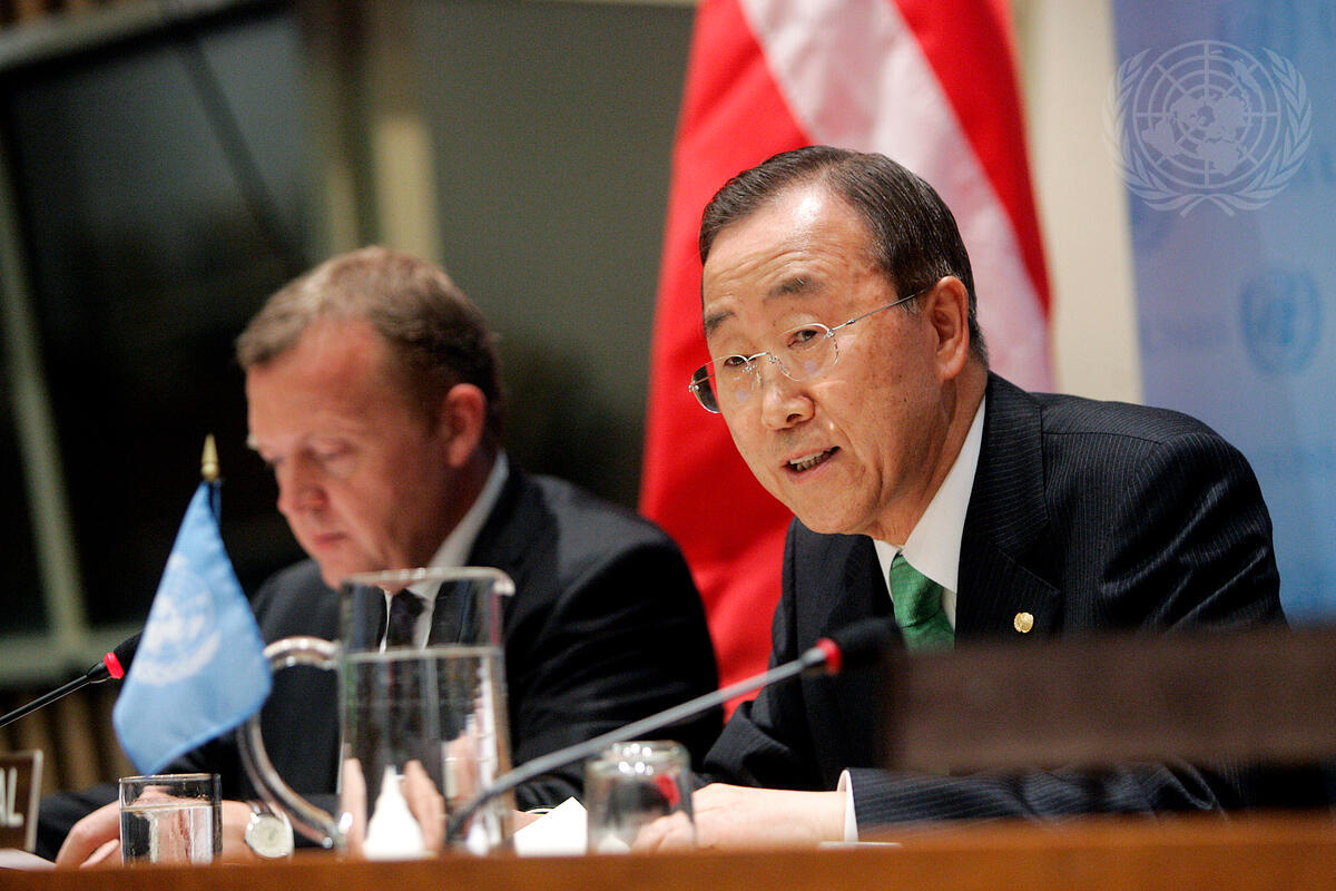 Secretary-General Ban Ki-moon (right) speaks at a press conference at the end of the Summit on Climate Change. With him is Prime Minister Lars Løkke Rasmussen of Denmark.