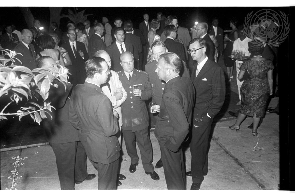 UN Secretary-General Dag Hammarskjöld was the guest of honour at an official reception held here this evening. The Secretary-General arrived in Leopoldville on 13 September, in response to an invitation by Premier Cyrille Adoula, to discuss United Nations aid and support to the Republic of the Congo.