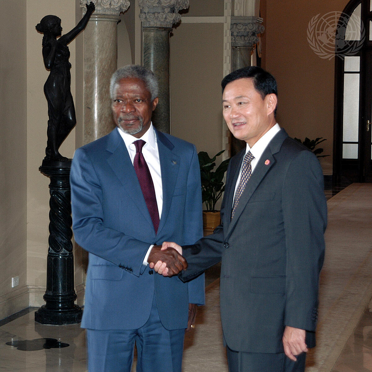 Secretary-General Kofi Annan (left) is greeted by Prime Minister Thaksin Shinawatra of Thailand, on his arrival at the Thai Government House in Bangkok