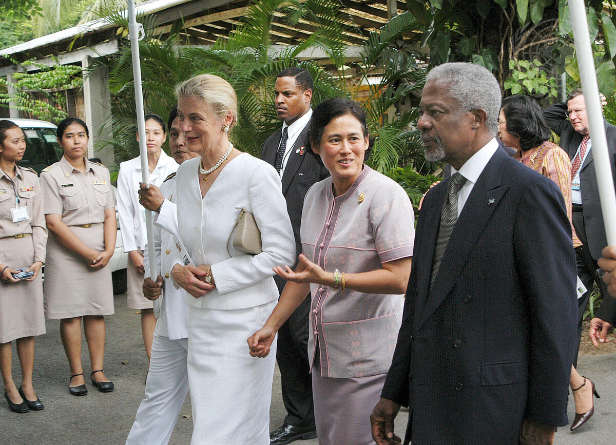 Secretary-General Kofi Annan (right) and Nane Annan (left) were the guests of Princess Maha Chakri Sirindhorn (centre) on a visit to the Royal Chitralada Projects and Support Center in the heart of Bangkok. The Princess works closely with the projects which research products and productions methods to help improve the health and welfare of the Thai People.
