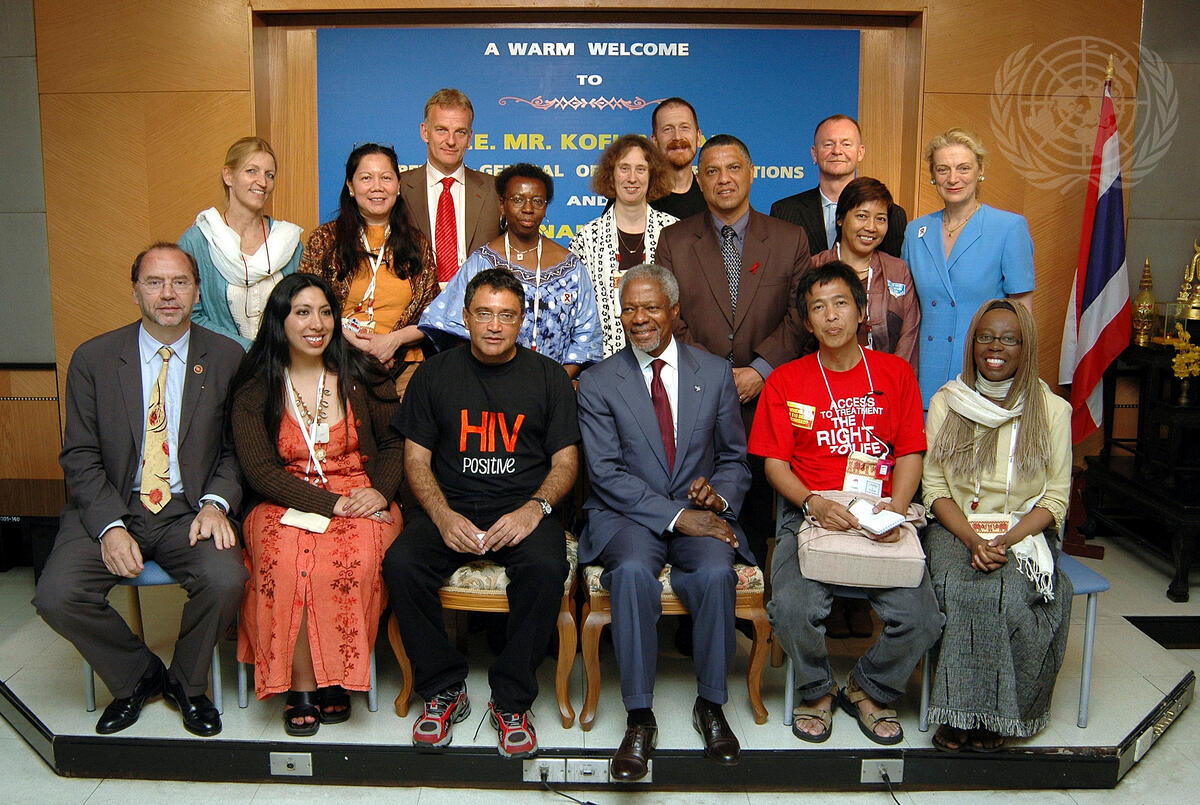 A group shot with Secretary-General Kofi Annan (fourth from left) with participants of the International HIV/AIDS Conference, at the AIDS Hospital in Bangkok.