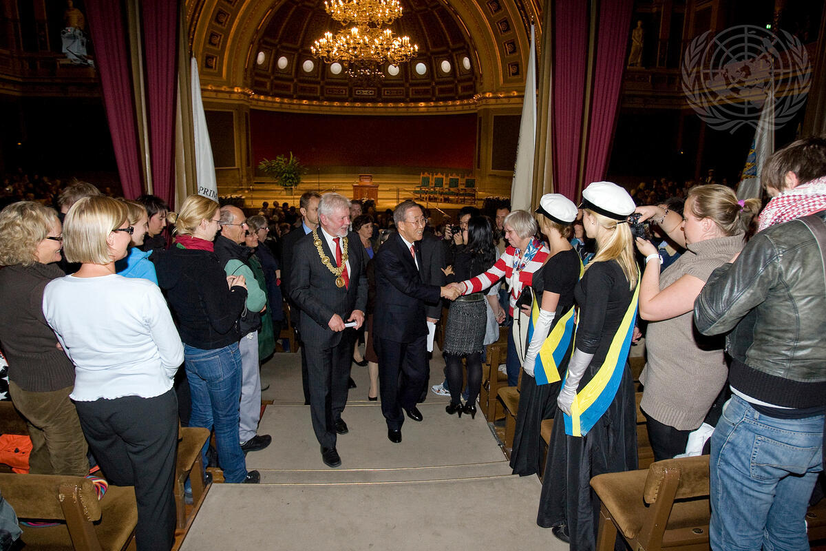 Secretary-General Ban Ki-moon (centre, right) greets members of the audience following his speech at Uppsala University. Citing the challenges coming at the world ""fast and furious"", the Secretary-General noted in his address, ""If ever there were a time to act in a spirit of renewed multilateralism -- a moment to create a United Nations of genuine collective action -- it is now.""