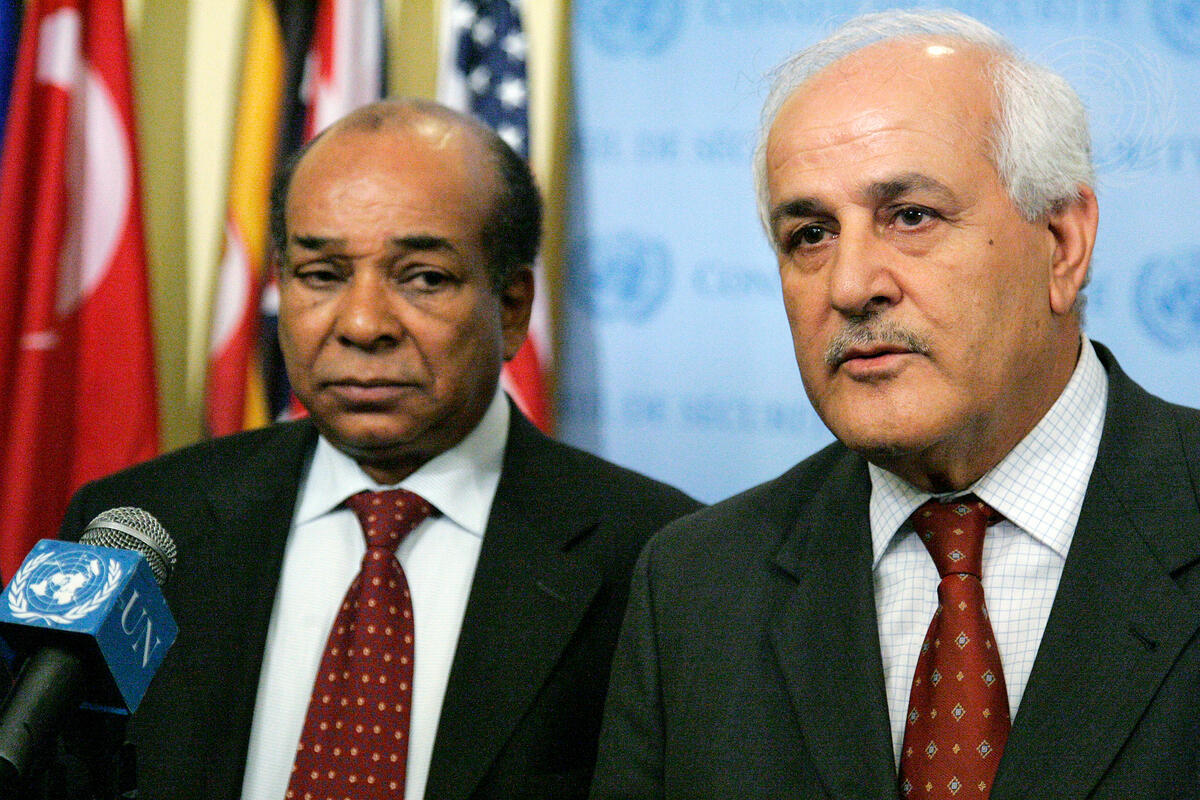 Riyad H. Mansour (right), Permanent Observer of the Permanent Observer Mission of Palestine to the United Nations, addresses correspondents on the Security Council open debate to be held next week regarding the report of the UN Fact-Finding Mission on the Gaza Conflict. With him is Abdurrahman Mohamed Shalgham, Permanent Representative of the Socialist People's Libyan Arab Jamahiriya to the UN. The Council debate on the issue is an initiative of Libya, with support from the Arab Group, the Non-Aligned Movement and the Organization of Islamic Conference.
