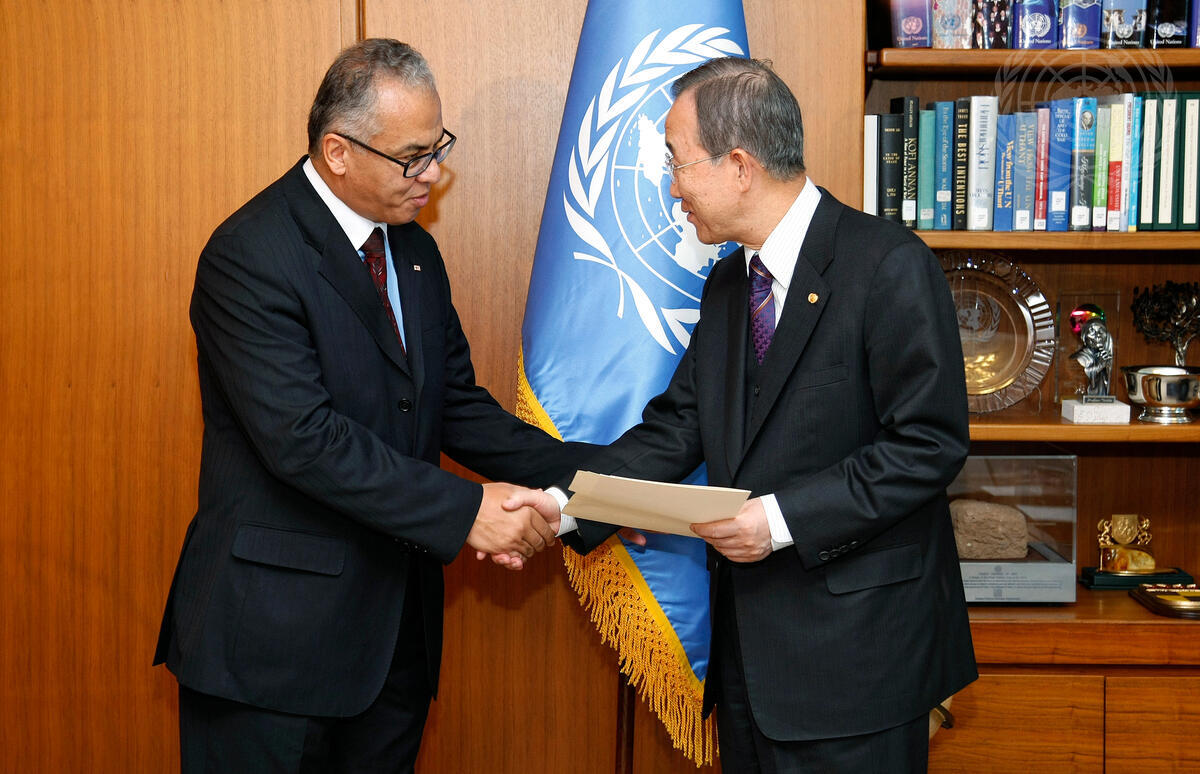 Marwan Jilani (left), Head of the Delegation of the International Federation of Red Cross and Red Crescent Societies (IFRC) to the United Nations, presents his credentials to Secretary-General Ban Ki-moon.