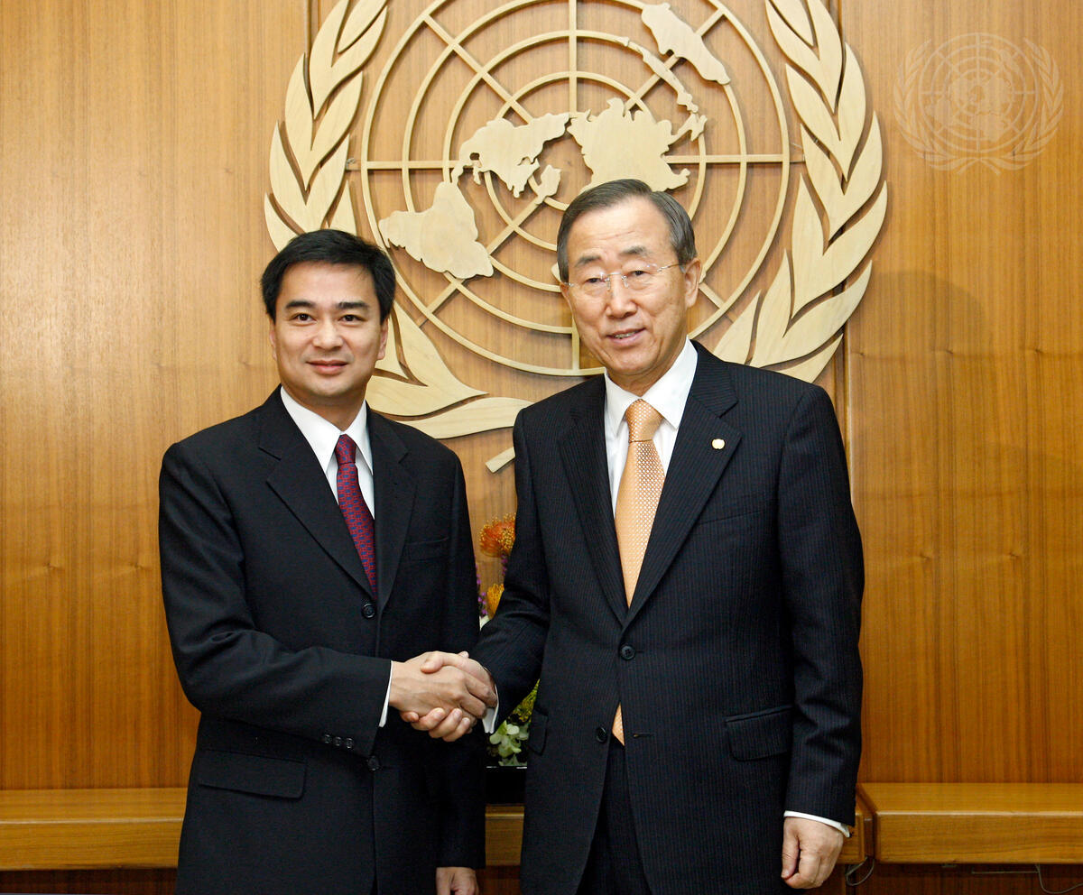 Secretary-General Ban Ki-moon (right) meets with Abhisit Vejjajiva, Prime Minister of Thailand.