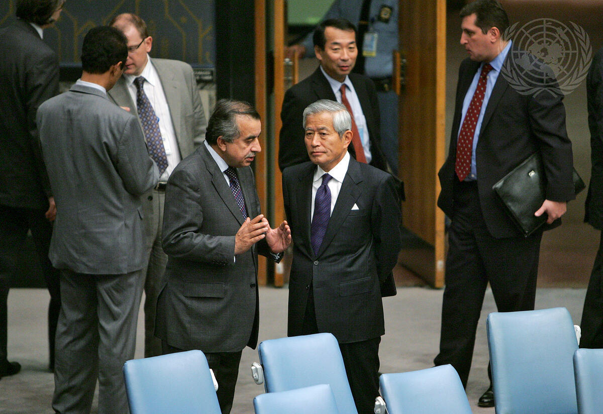 Zahir Tanin (centre, left), Permanent Representative of Afghanistan to the United Nations, converses with Yukio Takasu, Permanent Representative of Japan to the United Nations, in the Security Council Chamber. The Council unanimously adopted resolution 1890 (2009), based on a draft text submitted by Japan, extending the authorization of the International Security Assistance Force (ISAF) for 12 months beyond 13 October 2009.