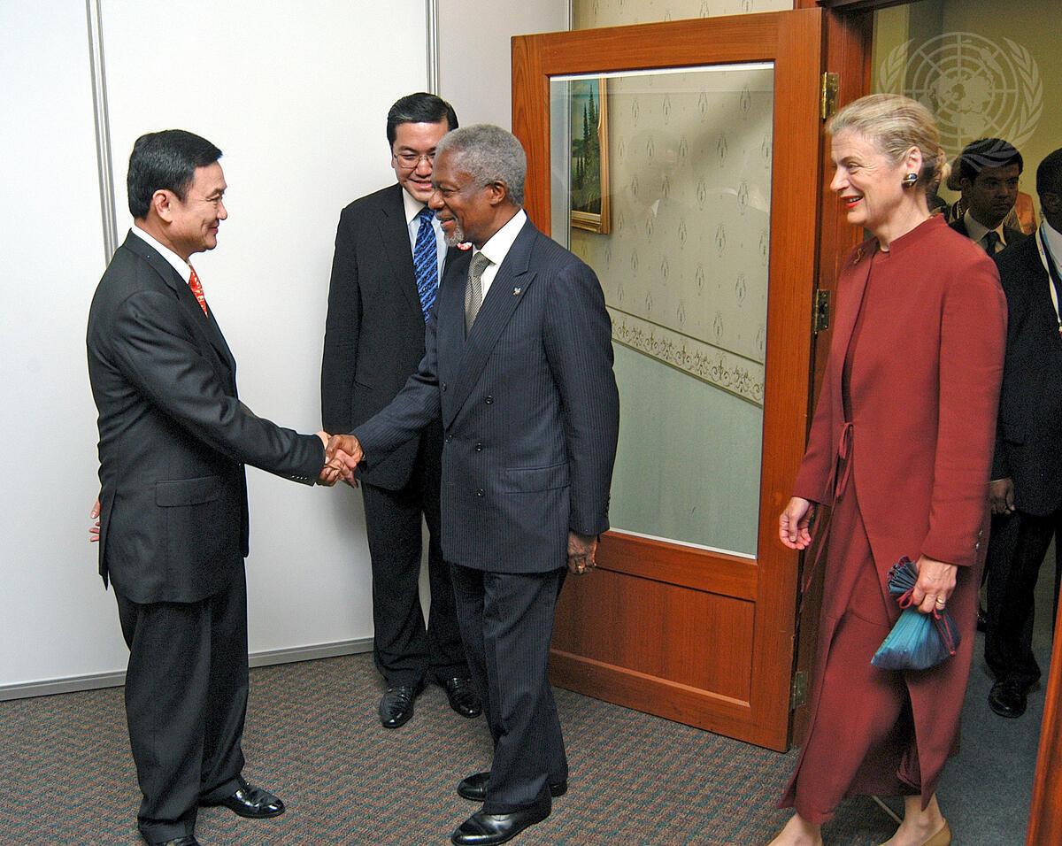 Secretary-General Kofi Annan (centre) and Nane Annan (right) are greeted by Prime Minister Thaksin Shinawatra (left) of Thailand, as they arrive to attend a reception shortly before the opening ceremony of the XV International AIDS Conference in Bangkok.