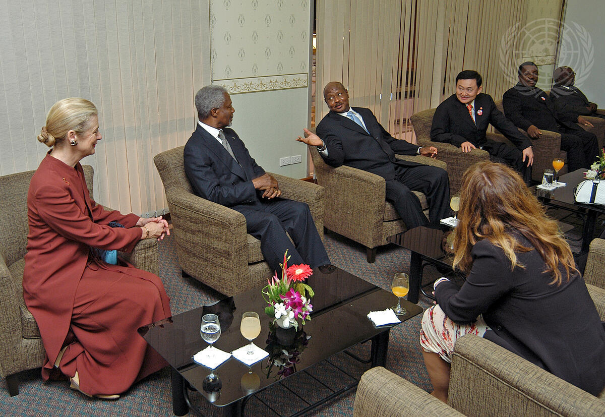 Secretary-General Kofi Annan (second from left), Nane Annan ( left), wife of the Secretary-General and President Yoweri Museveni (third from left) of Uganda and Prime Minister Thaksin Shinawatra (fourth from left) of Thailand at a reception shortly before the opening ceremony of the XV International AIDS Conference in Bangkok.