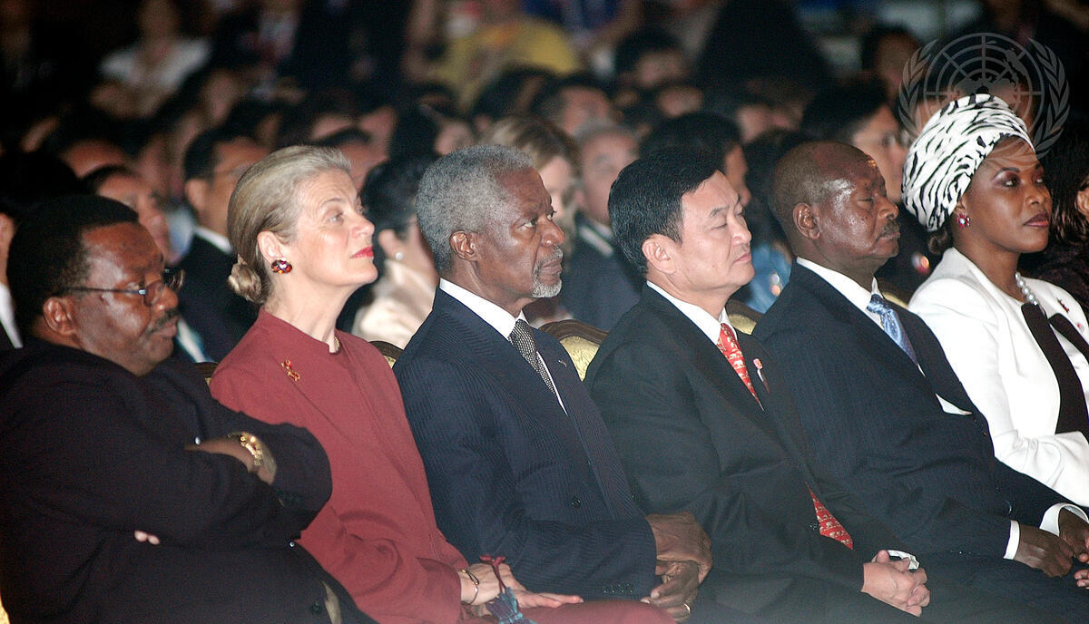 Attending the opening ceremony of the XV International AIDS Conference in Bangkok, from left to right are : Prime Minister Absalom Themba Dlamnini of Swaziland; Nane Annan, wife of the Secretary-General; Secretary-General Kofi Annan, Prime Minister Thaksin Shinawatra of Thailand; President Yoweri Museveni of Uganda and Edith Locie Bongo Ondimba, First Lady of Gabon.