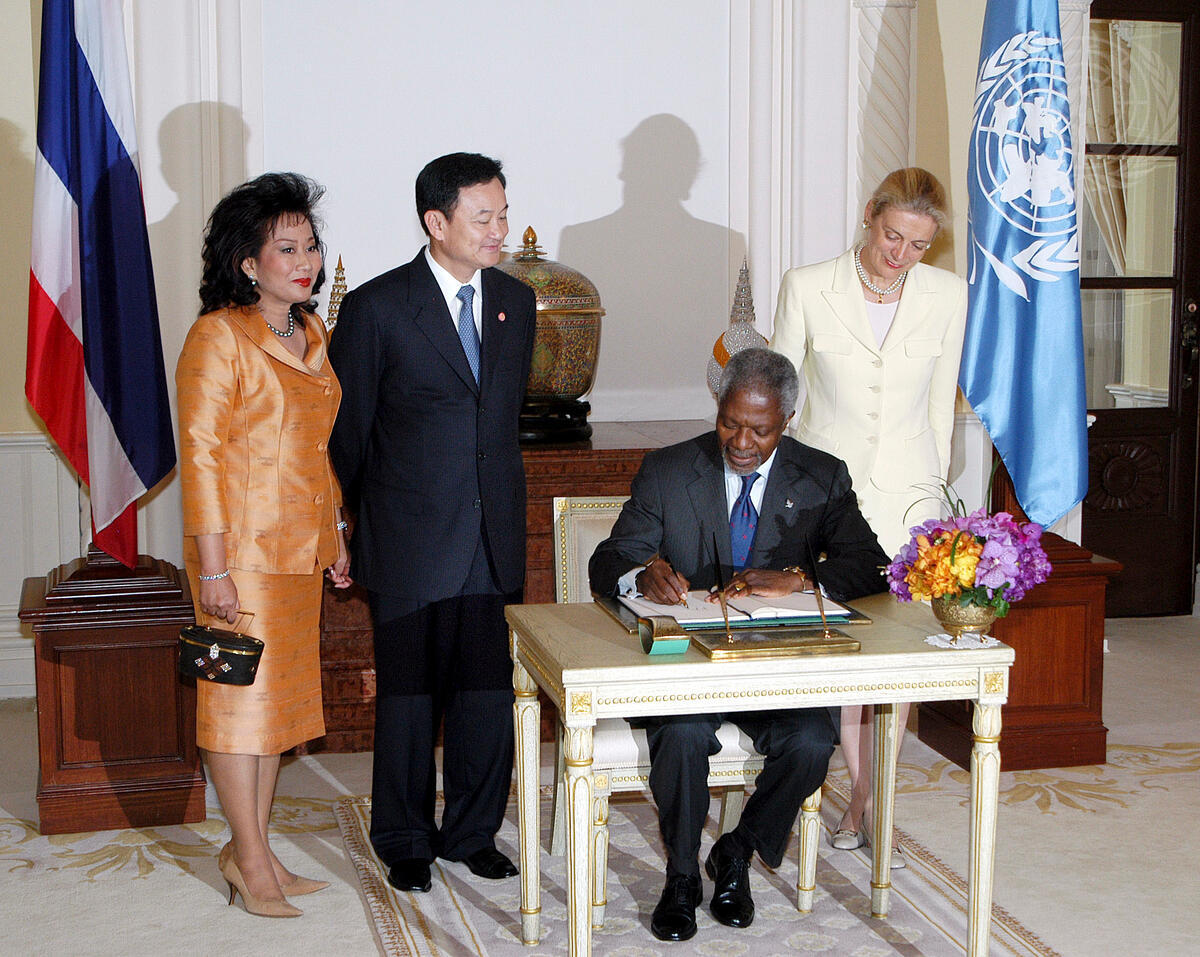 Secretary-General Kofi Annan signs the guest book at Government House in Bangkok. Also in the photo are Prime Minister Thaksin Shinawatra (second from left) of Thailand and Potjaman Shinawatra, wife of the Prime Minister (extreme left) and Nane Annan (right) wife of the Secretary-General at the Government House in Bangkok.