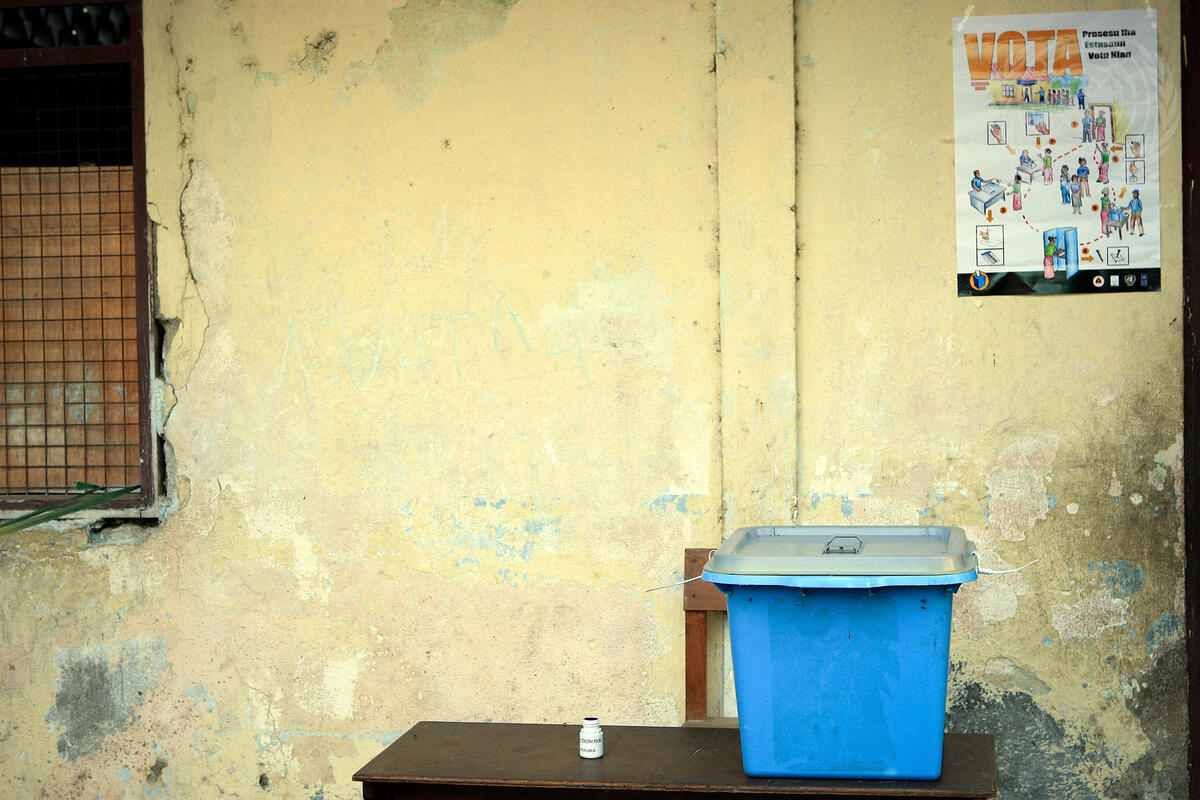 An indelible ink bottle and a ballot box at a polling station in Timor-Leste's Second National Village Council (sucos) elections. The elections, which are supervised by the United Nations Integrated Mission in Timor-Leste (UNMIT), are held simultaneously in 442 sucos across the country. Candidates are vying for positions as village chiefs and members of village councils for the first time since the first round of village elections in 2004 and 2005.
