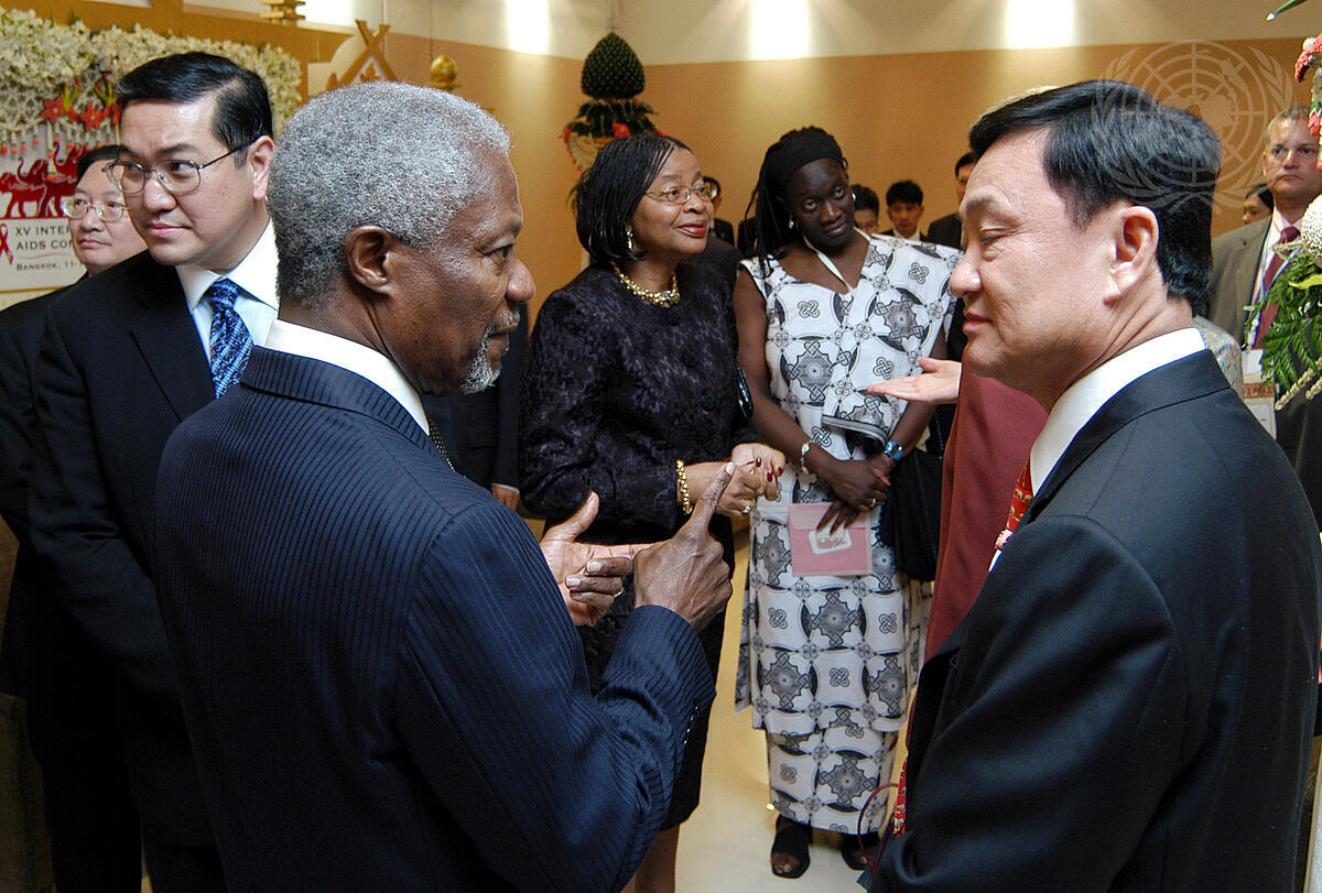 Secretary-General Kofi Annan (left) is seen talking to Prime Minister Thaksin Shinawatra of Thailand, shortly before the opening ceremony of the XV International AIDS Conference in Bangkok.