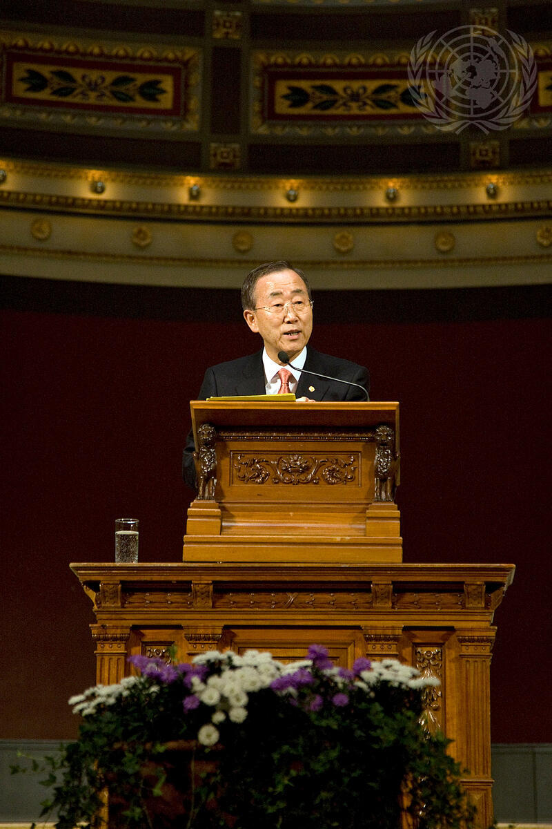 Secretary-General Ban Ki-moon delivers a speech at Uppsala University, where former Secretary-General Dag Hammarskjöld received his education. Citing the challenges coming at the world ""fast and furious"", the Secretary-General noted, ""If ever there were a time to act in a spirit of renewed multilateralism -- a moment to create a United Nations of genuine collective action -- it is now.""